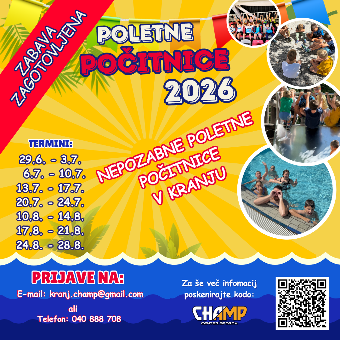 Športni center Champ Kranj bo z vami tudi to poletje organiziral aktivne in zabavne otroške poletne počitnice za otroke. Programi so namenjeni otrokom 6. - 12. leta starosti.
